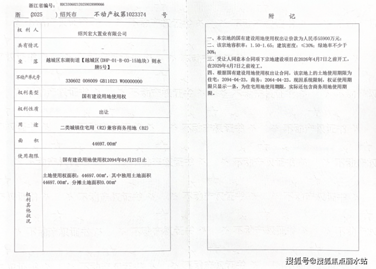 近日,在越城区委、区政府、规划部门及东湖街道的高效协同与鼎力支持下,绍兴宏大置业有限公司开发的“宏大·蝶畔府”项目,不仅克服了前期诸多困难,更以令人瞩目的“越城速度”——从完成土地款项缴纳到正式获取土地权证仅用时两天,生动诠释了“首位立区,幸福越城”所营造的卓越营商环境。这为企业专注开发奠定了坚实基础。