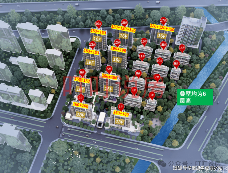 整个地块共20幢房子,其中10幢叠墅(上、中、下三叠),9幢小高层(13-16F)和1幢办公楼(14F)组成。