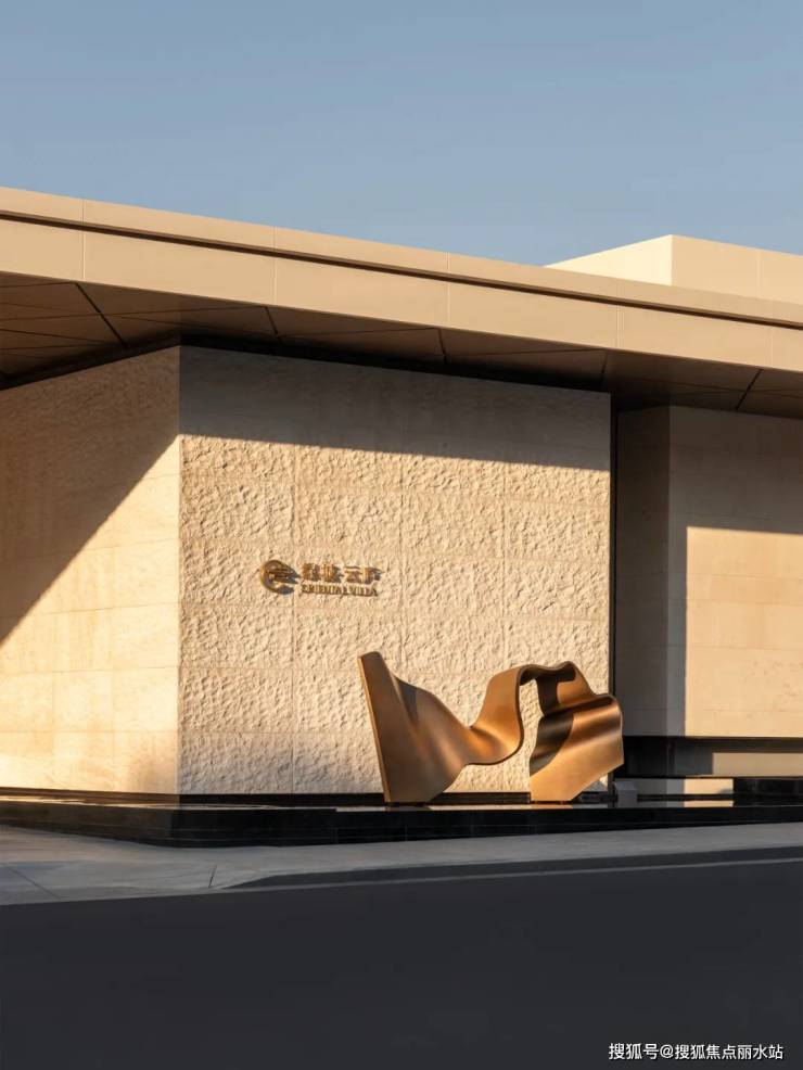 外立面的景墙用的是贝金米黄和孔雀玉石材,质地细腻,颜色温润,整体感觉既高级又沉稳
