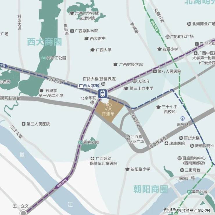 项目位于西乡塘区大学东路19号(五里亭蔬菜批发市场原址),地铁1号线与5号线(在建)换乘站——广西大学站C、B2出口旁,紧临城市主干道——大学东路、清厢快速路