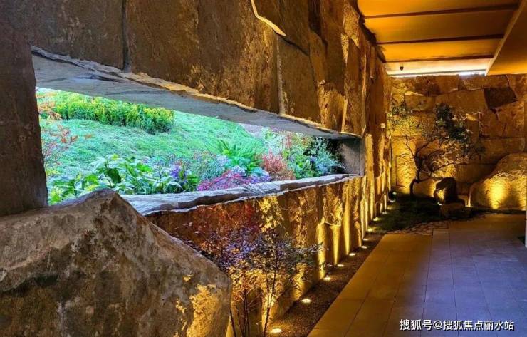 从这儿出来后,便是期待已久的下沉庭院:火山石、陶缸、乌桕树、鹅卵石覆底的叠水池,跟项目周围的山湖资源内外呼应。