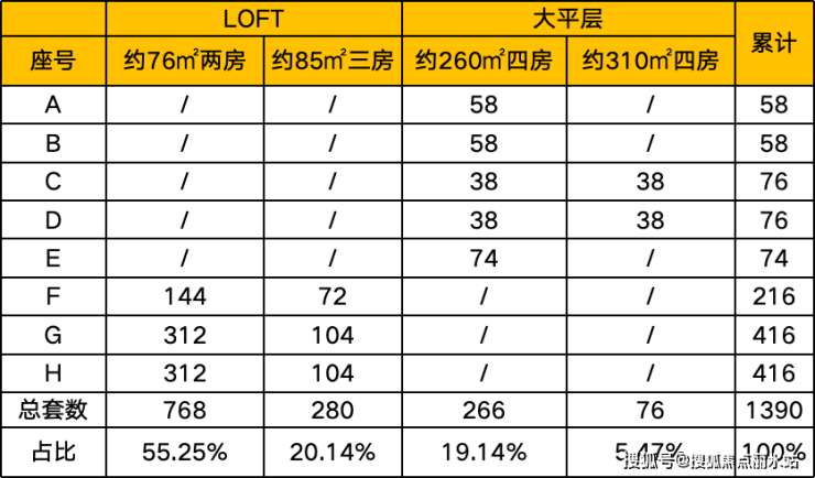 项目分东、西区,总套数为1390套。西区为大户商务公寓,主力户型为260/310㎡大平层单位。东区为商办公寓,为小面积LOFT单位。
