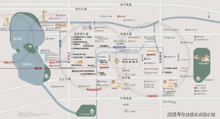 · 最便捷的交通:3条地铁(约400米轨交6号线、1号线、17号线)、3条高铁线路(通苏嘉甬铁路、苏锡常城际铁路、苏淀沪城际铁路)、2条城市主干道(甪直大道、东方大道)、1个高铁站(高铁苏州东站)