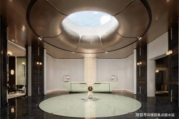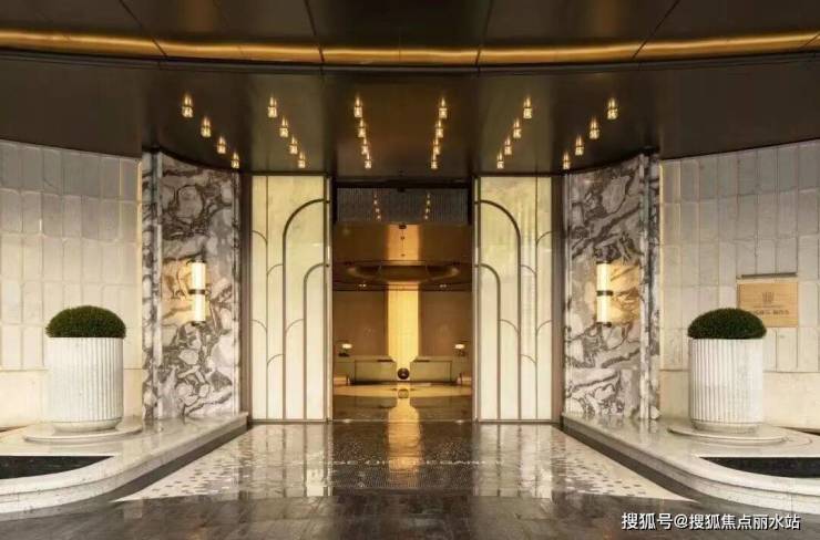 主入口以巴西白金石与水景、百年老桩石榴树打造对称的迎宾序列,仅四扇透光白玉石的大门造价就超百万,塑造出CBD内极具辨识度的归家形象,也成为业主尊贵的身份感的第一重表达。