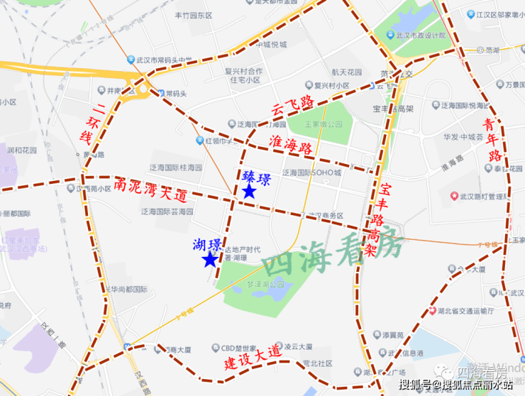 自驾:CBD板块还未开发完成,所以有不少断头路,目前两个地块要上二环线需要沿淮海路往西走,走云飞路可至宝丰路高架和青年路。未来云飞路可以连接到建设大道,上二环到汉阳会更近。另外在两个地块中间还有一个南泥湾大道延长线,目前在扩建改造,未来也是项目出行的一个重要道路。