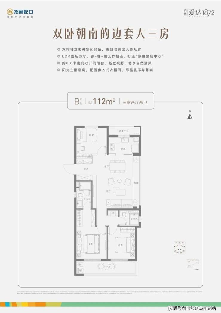 建面约112㎡三房两厅两卫:超大尺度的一体化餐客厅公区空间,面积约达29㎡,北接U型厨房,南连“跑道式”阳台,动线布局合理,极大地拓宽了场景空间尺度。