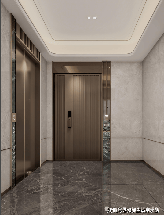 继续往里走,穿过酒店式入户大堂,进入电梯轿厢,里面装饰着艺术岩板,尊贵大气中透着低调的奢华。