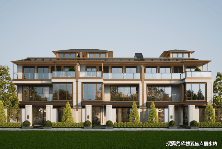 建筑立面,融贯当代精工与民国优雅,再现“平坡屋顶、连续拱券”的经典语汇。大面LOW-E玻璃+通透玻璃栏杆,在光影呢喃间,示范通透澄明的生活美学。