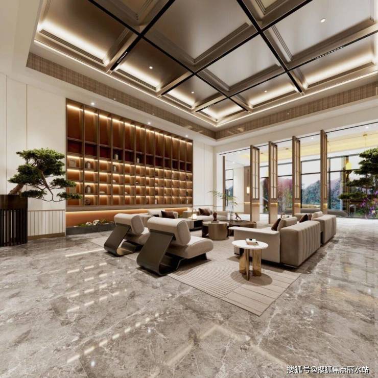先说说“回家的仪式感”。麓峯主入口颇下功夫:53米长、6米高的门庭采用干挂石材,雕刻山峯图案,两侧配以镜面水景与迎客松,宛如走进高端酒店。