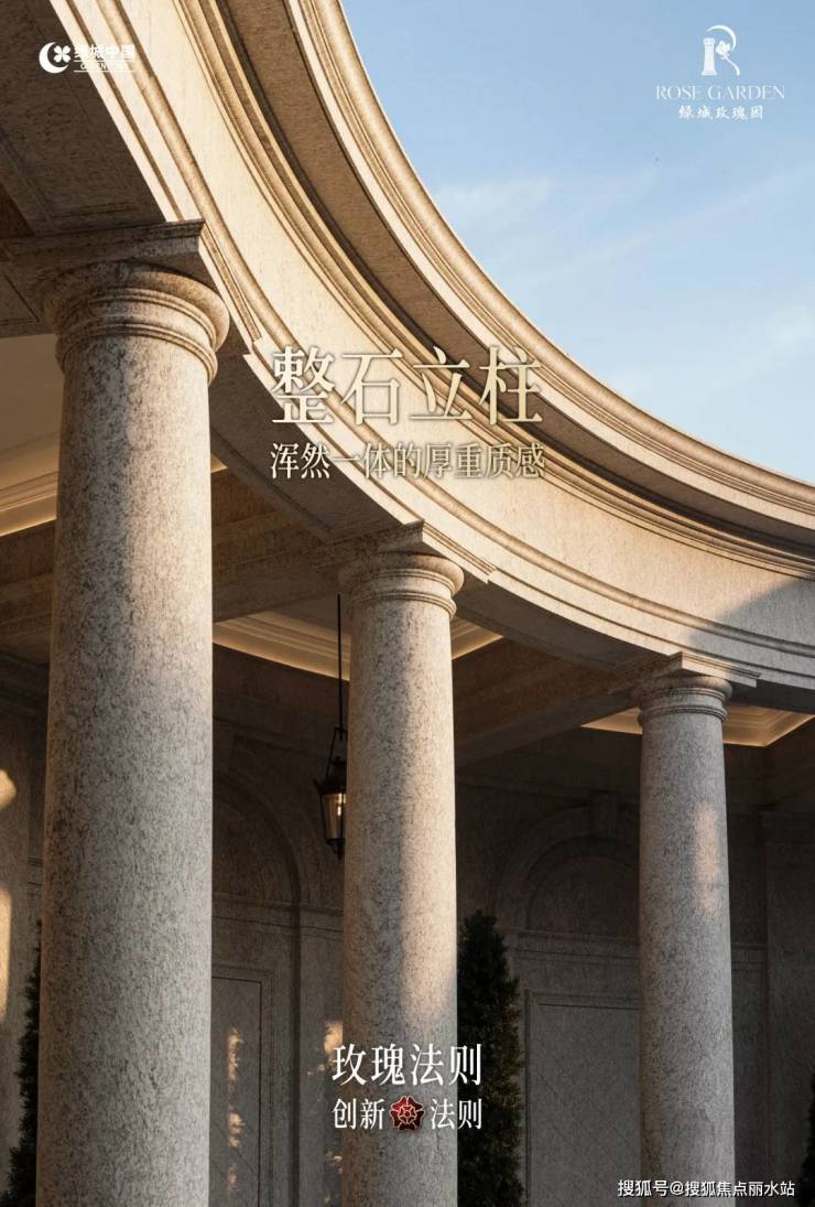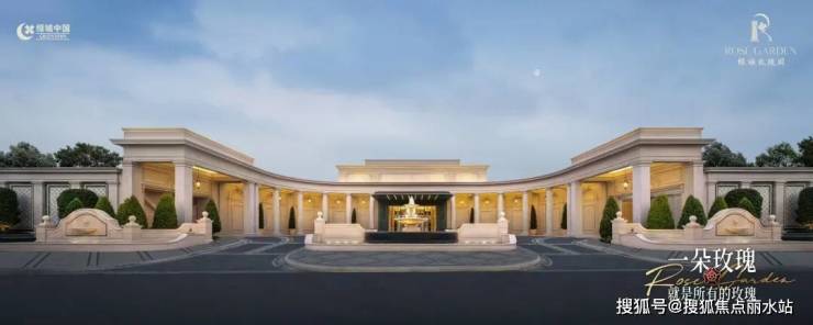 项目主入口由一排罗马柱廊组成,横向超100米的尺度连成一道艺术弧线,气势恢弘。