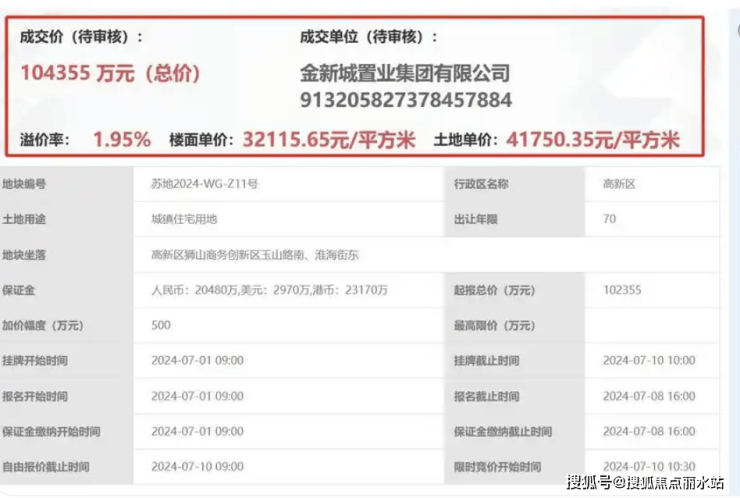 2024年7月10日,经过5轮竞价,狮山上璟府(苏地2024-WG-Z11号)地块由金新城置业以10.4355亿元总价竞得该地块,成交楼面价达32116元/平方米,溢价率1.95%。后由于种种原因,金新城退出,苏高新操盘。