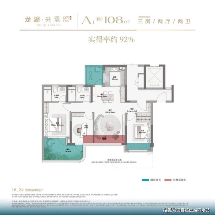 建面约108㎡户型,在有限面积内实现了高达约92%的实得率。南向面宽约12.55米,让三间卧室得以一字排开,确保极致采光;