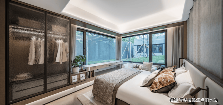 迈入归家大堂,一整面弧形落地窗,将小区园林如画卷般在眼前铺开。