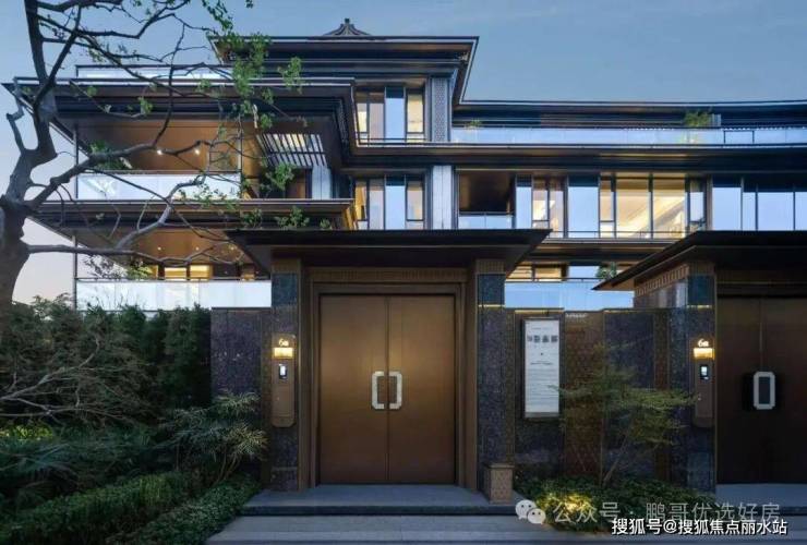 PART3⃣建筑美学,循古创新建筑立面采用了石材、大面积玻璃为主要材质;细节之处设计师搭配白色石材和鎏金线条,借鉴蜀山先照寺的重檐叠韵,独创镂空金属格栅,赋予立面吉祥如意,让建筑既是居所,亦是可传世的艺术珍藏。