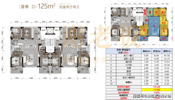 一梯一户(电梯AB门)设计,实得室内面积131.62㎡,套内得房率110%,算上独立电梯前室,使用率更是达到115%,相当于“负公摊”。
