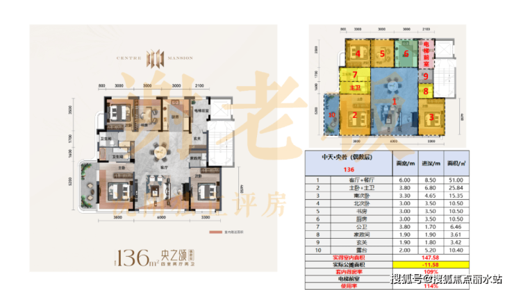 136平:套内得房率108%,使用率114%
