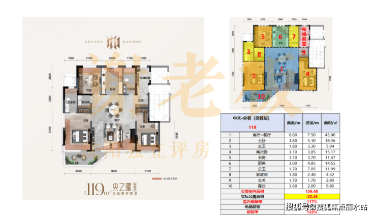 119平:套内得房率117%-118%,使用率123%