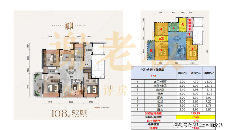 108平:套内得房率106%-107%,使用率113%