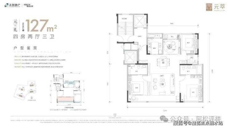 建面约127平,四房两厅三卫: