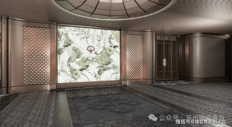 酒店式入户门庭,奢石入户铺装,专属定制千道龙纹鎏金屏风,彰显尊崇的冷翡翠玉石家族幕墙,打造独具东方特色的精致感。