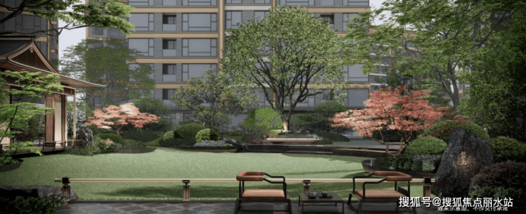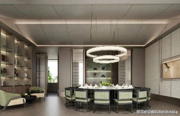 并且整体抬高社区约1.5米,形成"托盘托举明珠"的归家尊贵感,隔离城市喧嚣。抬升不仅提升了社区的仪式感与私密性,更让地下空间告别潮湿。这样的整体布局,从外到内营造出明亮舒朗和开敞的呼吸感,带来东方气韵的总体感受。