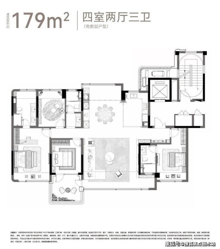 179㎡奇数层,一梯一户,私密性很好。四房两厅三卫,客厅开间约6米,南北双向阳台均为大面积落地窗,两侧均带上下水,北阳台可以用作家政间。值得一提的是,为了更好地隔音,南向玻璃还采用了四玻两腔。