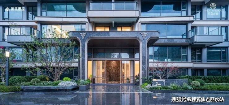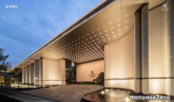 用材上,选用保加利亚进口的维纳多石材,顶部搭配柬埔寨进口的温德姆灰大理石,威仪之气不彰自显。两侧迎宾水景和高大绿植,营造出温润的松弛质感。