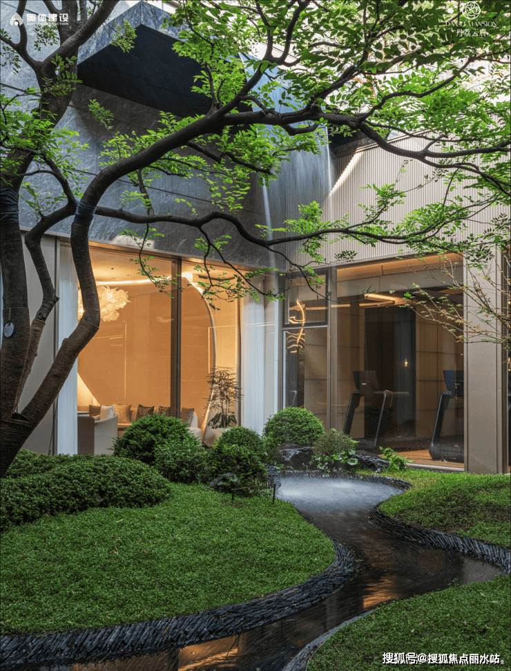 下沉式庭院中,植株高大且茂密,中央处的跌水瀑布从高处流下,再汇聚成溪流缓缓流淌,这一处的造景绝了。