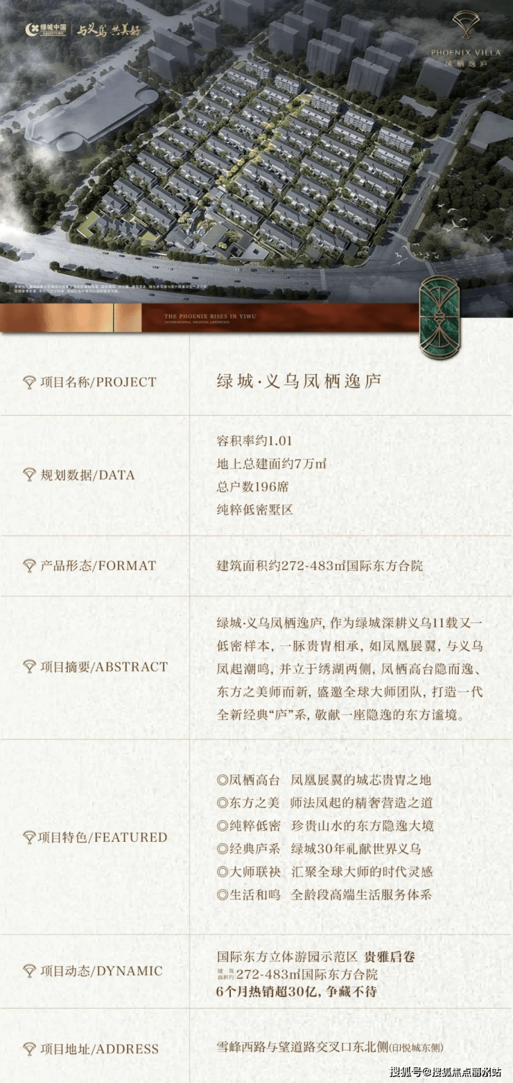 义乌凤栖逸庐的热销不仅是一个项目的成功,更是对"好产品没有淡季"这一市场定律的生动诠释!此时此刻,义乌凤栖逸庐建面约272-483㎡国际东方合院当红热藏,致谢一座城市的厚爱。
