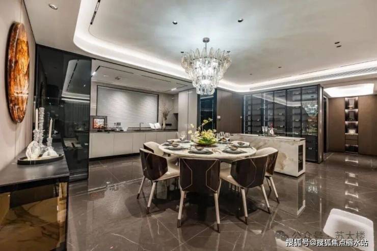 建面约228㎡实景细节如下:u型厨房,斯麦格灶具+蒸烤一体机+洗碗机+内嵌冰箱,还有天花吊顶、背景墙曲线,配有独立西厨岛台交付。