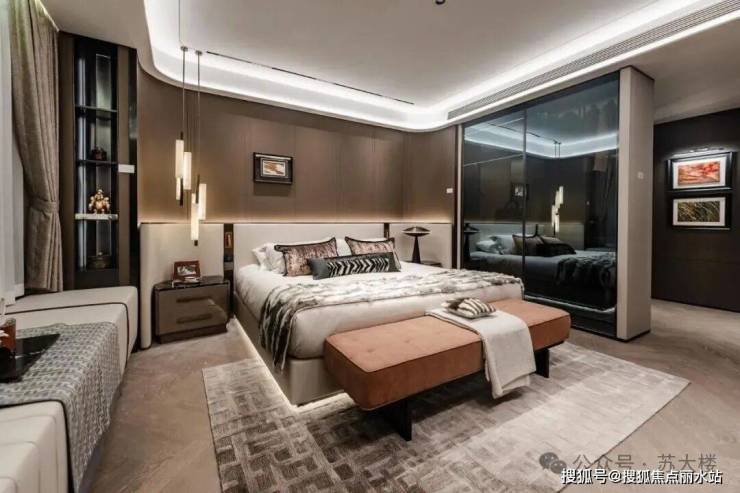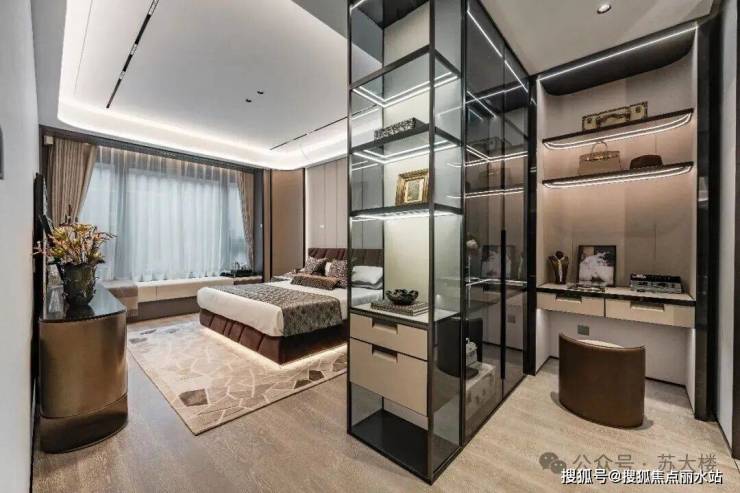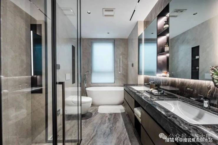 主卧内部设立通顶衣柜+化妆区,卫采用品牌劳芬、当代,配备双台盆、大浴缸、淋浴、马桶、美妆冰箱。
