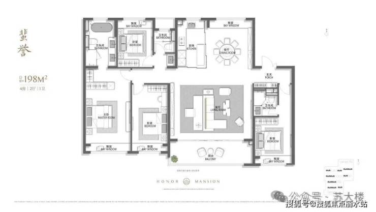 建面约198㎡洋房南向总面宽约17米,约6.9米阳台,餐厅带飘窗,南北通透,客厅、南向主次卧进深升级,延展空间。