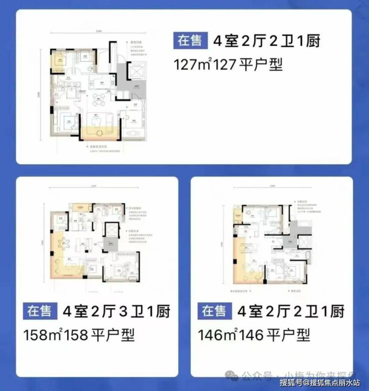 项目一共4栋住宅,分别是1号楼26层、2号楼23层、3号楼19层、4号楼25层。这个项目楼层不高的一个重要原因,是因地处黄鹤楼视线控制区内,建筑高度被控制在80米以内。户型有三种户型127-148-158平户均建面约135平所以项目偏改善性住房。都是四房的设计。
