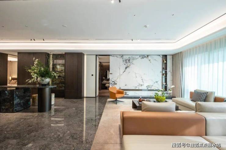 从样板间的两个空间看,其一是195户型客厅,在3.3米的层高衬托下,6.5米的宽厅极具方正感,实际空间内已经融入客厅、书房、岛台等多功能的舒适空间!