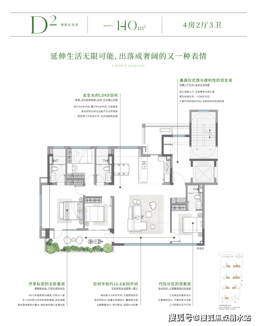 建面约140m²洋房产品,匹配一梯两户双开门设计,南向双套房,带来仪式感的同时又能实现多代户的“平权”;主卧两面开窗L型采光设计,配备独立卫浴与独立衣帽间;LDBK空间设计,以开放式布局、多功能融合,将公共空间随机切换成亲子游戏区、家庭影院、阅读角或工作台。