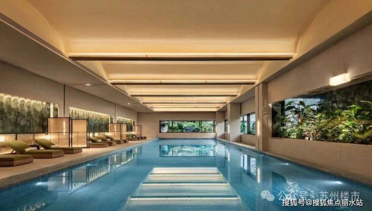 约1800㎡下沉式会所功能全面升级,恒温泳池拥有波浪型穹顶与《水中的宝玉》马赛克铺贴,正对通透玻璃窗可赏园景。同时配备瑜伽室、健身房、VIP女王空间、行政酒廊、茶室及艺术馆等。
