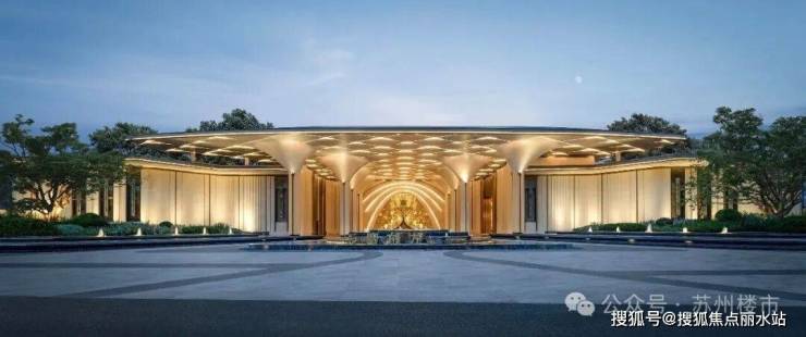 天熠东方主入口"玉阙迎辉",宽达44米、高5.2米!玉树飞檐门柱气场全开,"八方来仪"殿堂式立柱拔地而起,弧线向上尽显望族门风永续。站在门口就能感受到扑面而来的豪门气场。