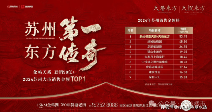先看天系的品质背书:2024年1.0天悦东方、2.0天誉东方,凭借卓越品质与独特魅力,在竞争激烈的苏州房地产市场中脱颖而出,劲销50亿+,荣登2024苏州大市销售金额TOP1,这一辉煌成绩无疑是对天字系产品的高度认可。