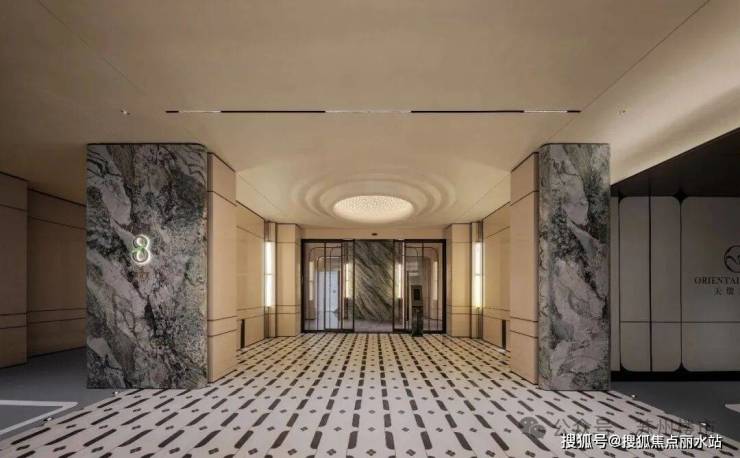 坡道柱廊阵列显古典,穿插透光云石+智能随亮灯,美学科技拉满;门楣奢石点题,入门光厅引客,车马厅腕表布局配珐琅地,细节尽显奢华!