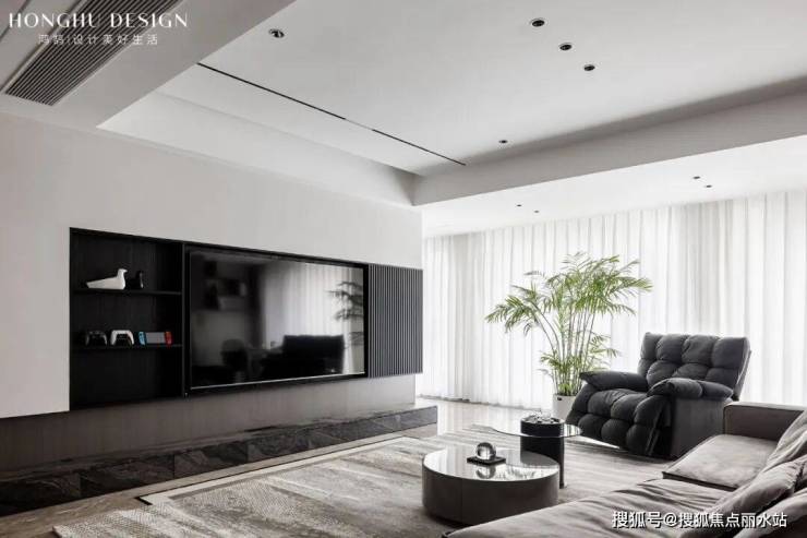 背景墙进化:铲除原有石材,用石膏板基底+黑色金属电视框重塑极简视觉。底部增设3.6米胡桃木地台柜,既隐藏设备电线,又与阳台地台材质呼应,形成空间暗线。