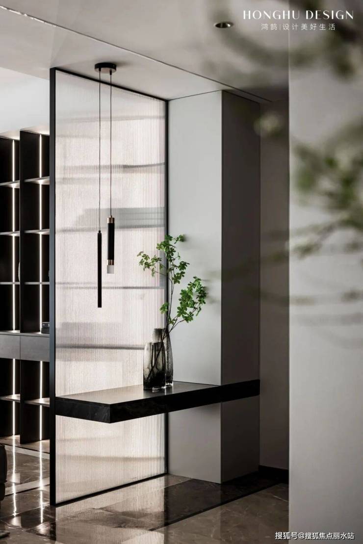 改为玻璃隔断+沙发后整面柜形式,增加入户 采光和空间感,沙发后定制整面柜,增加公区的收纳展示空间。