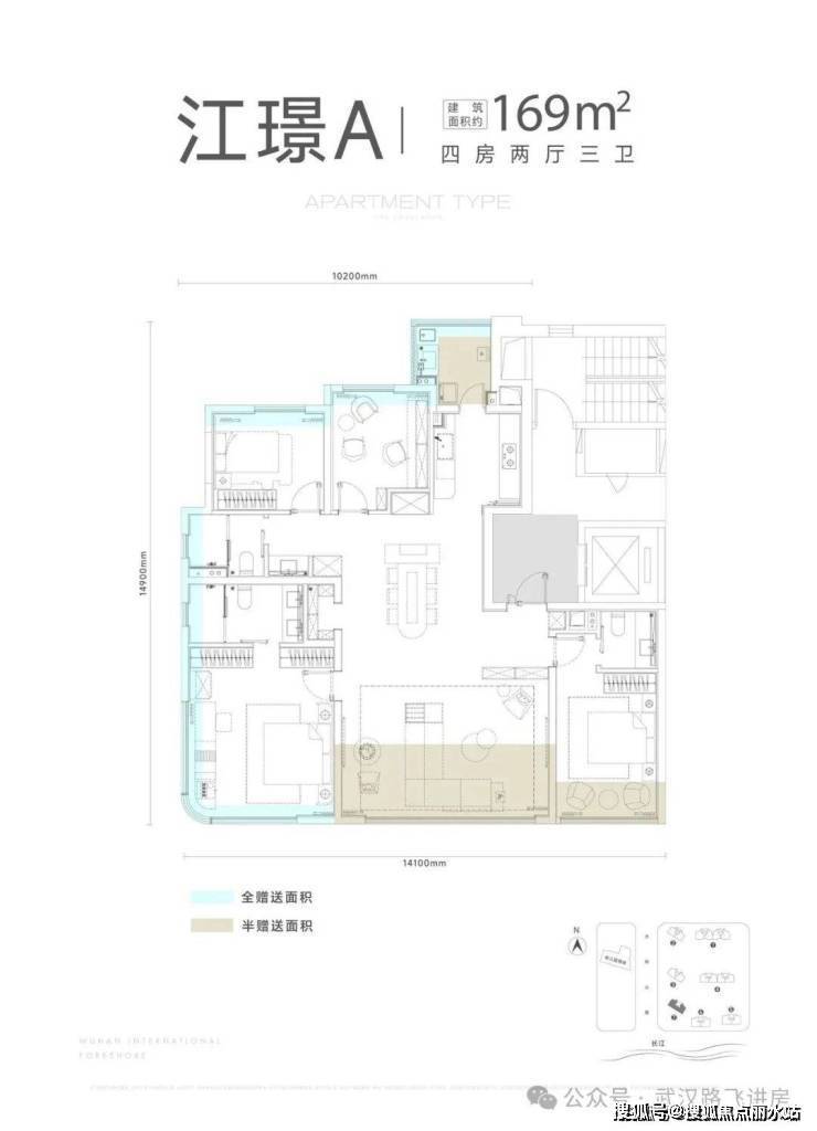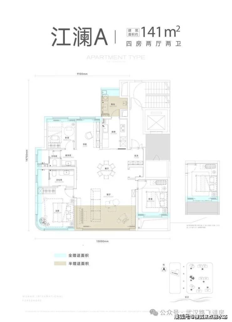 所有楼栋都是两梯两户设计,这意味着每户都有专属电梯前室可供使用;启元计划首推 3、6、7 号楼,其中 6、7 号楼均为头排观江楼栋,位置很有吸引力。三栋住宅的户型面积分别为 141、189、169 平,下面具体看看这三个户型: