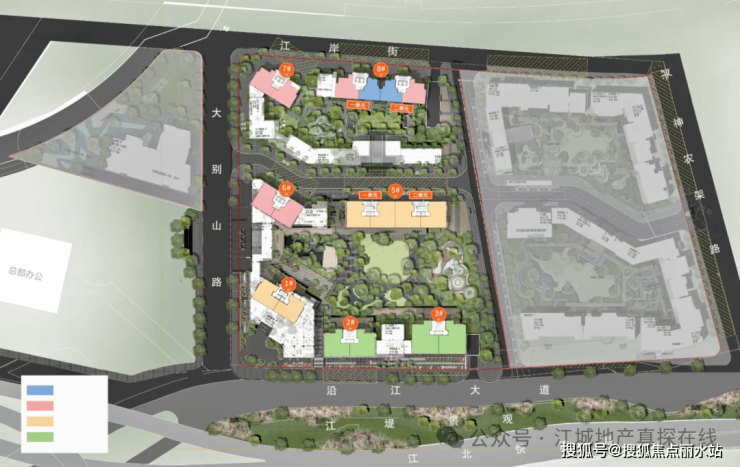 从规划图也可以看到,项目距离长江仅约100米左右,是一线临江楼盘,尤其是最南向三栋楼为无高层遮挡的一线观江,地块也比较完整,朝向和视野较好,住宅楼栋面江由低到高排布,保证了看江房源数量的最大化。