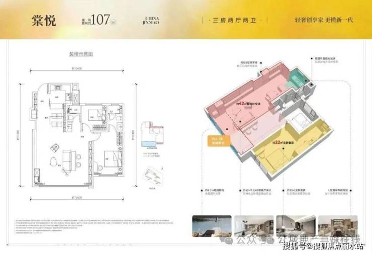 高层房源中在售的主要是建面约107平三房两厅两卫: