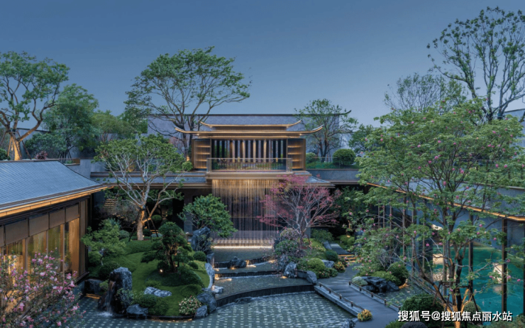 下沉庭院会所打造壮观的银河飞瀑,与园外奔流的瓯江遥相呼应,壮丽飞瀑与静谧庭院巧妙结合,创造出沉浸式感官体验。