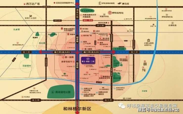 项目西紧邻玉泉区贯穿南北的中轴线——昭君路上,昭君路为双向四车道,呼市的城市一级交通要道,同时昭君路也是连通和林格尔云谷新区以及盛乐国际机场的主干道之一;南连接南三环快速路,北侧为南二环快速路及快速路入口。是呼市政府打造的半小时经济生活圈重要道路之一。