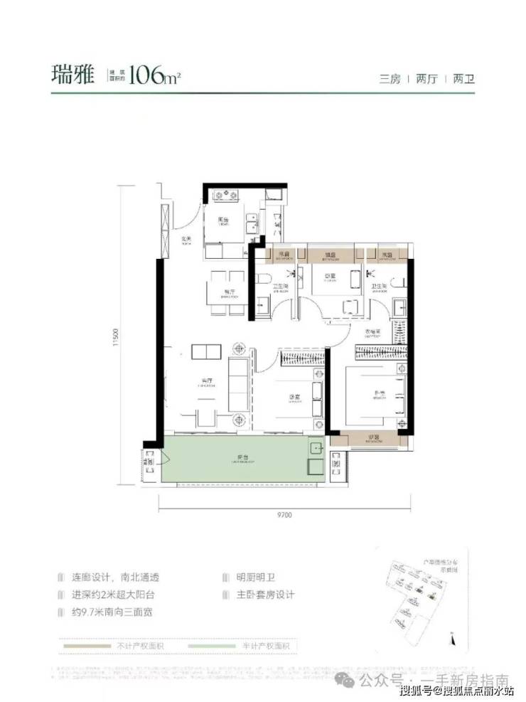 106平户型如果不按准四代的标准看,放在常规户型中,应该是一个蛮不错的户型,南向开间约9.7米,比较宽绰,而且次卧靠客厅的墙应该是可以敲掉的,可以改造成大横厅格局。