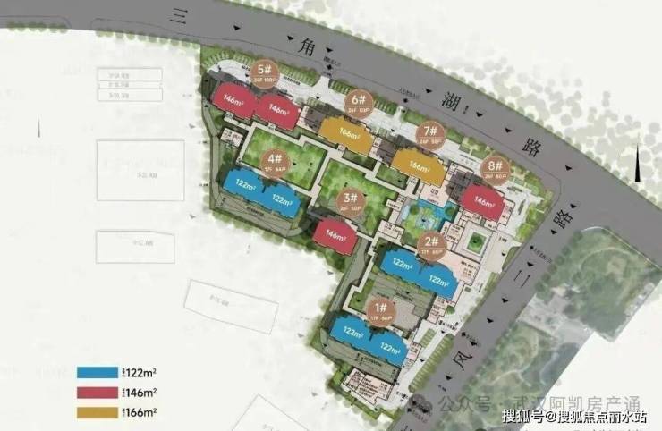首推楼栋都紧邻小区大门和景观庭院、会所等,7、8号楼位于小区北侧,高区可看三角湖,视野极好。