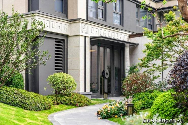 不像传统的单元门设计,观云府通过飞檐翘角搭配卡麦色石材回纹雕刻,金属线条与椽子的碰撞间,将传统礼制的庄重与现代审美的利落相融合,并且单元门两侧的景观也是定制的,入户红枫、四季桂等乔木、灌木精致搭配,归家仪式感十足。