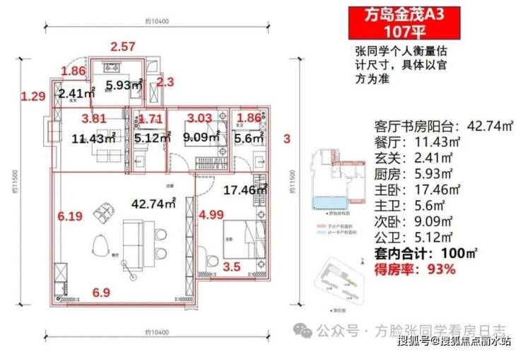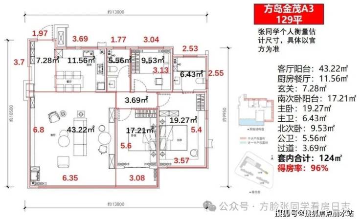 这是我根据官方户型图,倒推的各个空间尺寸,其中建筑面积107平的套内得房率93%,建筑面积的129平套内得房率96%,从数据上看还可以,比之前A2晓棠的87%略高。